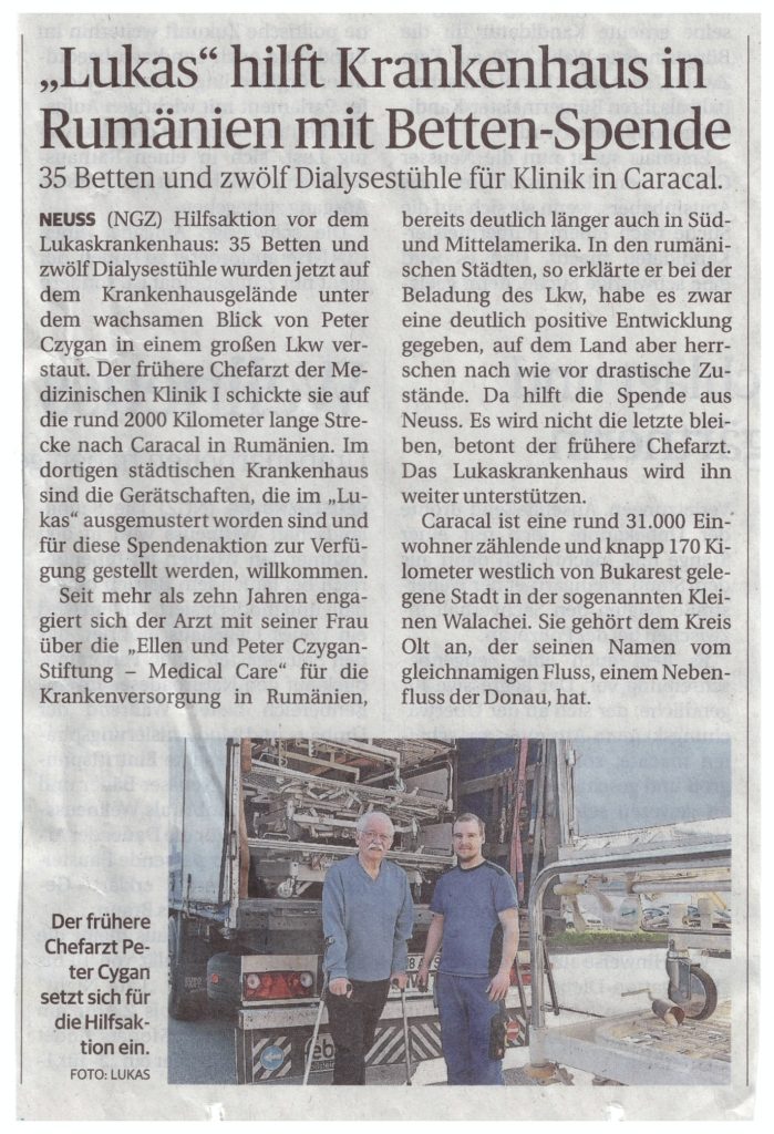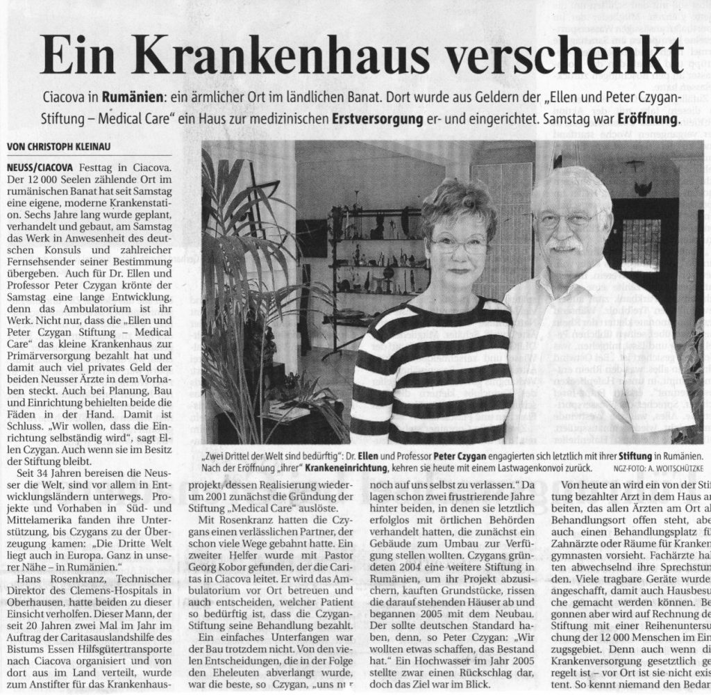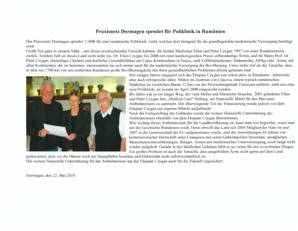 Hörgeräte für Rumänien Zu Ihrer großen Freude erhielten Frau Dr.Ellen und Prof.Dr.Peter Czygan von der Firma Geers eine Spende von 100 gebrauchten Hörgeräten. Der Überbringer der Hörgeräte, Hörakustikmeister Armin Tschierschke versprach,j edes Hörgerät noch einmal auf Funktionsfähigkeit zu überprüfen.Die Geräte dienen der Versorgung armer alter Menschen in Ciacova/Rumänien, wo das Ehepaar Czygan zusammen mit Hans Rosenkranz 2008 ein Ambulatorium aufgebaut hat.Der dortige HNO-Arzt wird die Hörgeräte v.a. bei Altenheimbewohnern anpassen,die dankbar sind, sich ein wenig unterhalten zu können, eine der wenigen Freuden,die ihnen bleiben.